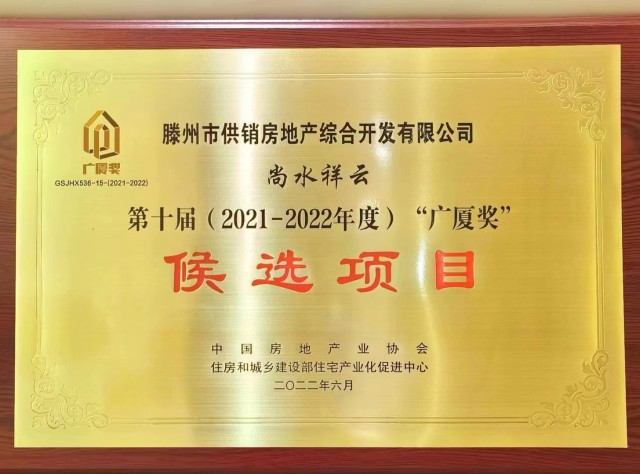 7月30日,由中國房地產業協會、住房和城鄉建設部住宅產業化促進中心共同評選的第十屆“廣廈獎”獲獎名單正式揭曉,滕州市供銷房地產開發有限公司打造的尚水祥云項目憑借先進理念、建筑創新以及綜合實力等多維優勢,經過專家評審組嚴格評審、實地考察,最終入圍第十屆(2021-2022年度)“廣廈獎”候選項目。