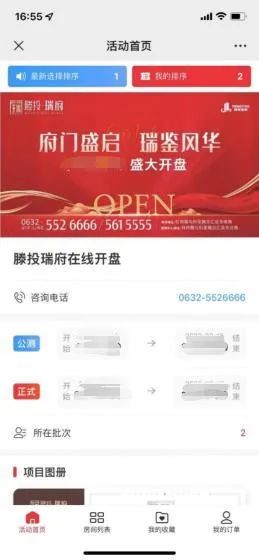 (注:藍色框為當前進行中的選房批次,紅色框為不同批次客戶所處的選房批次,正式開盤時間顯示的為第一批選房人員開始時間)