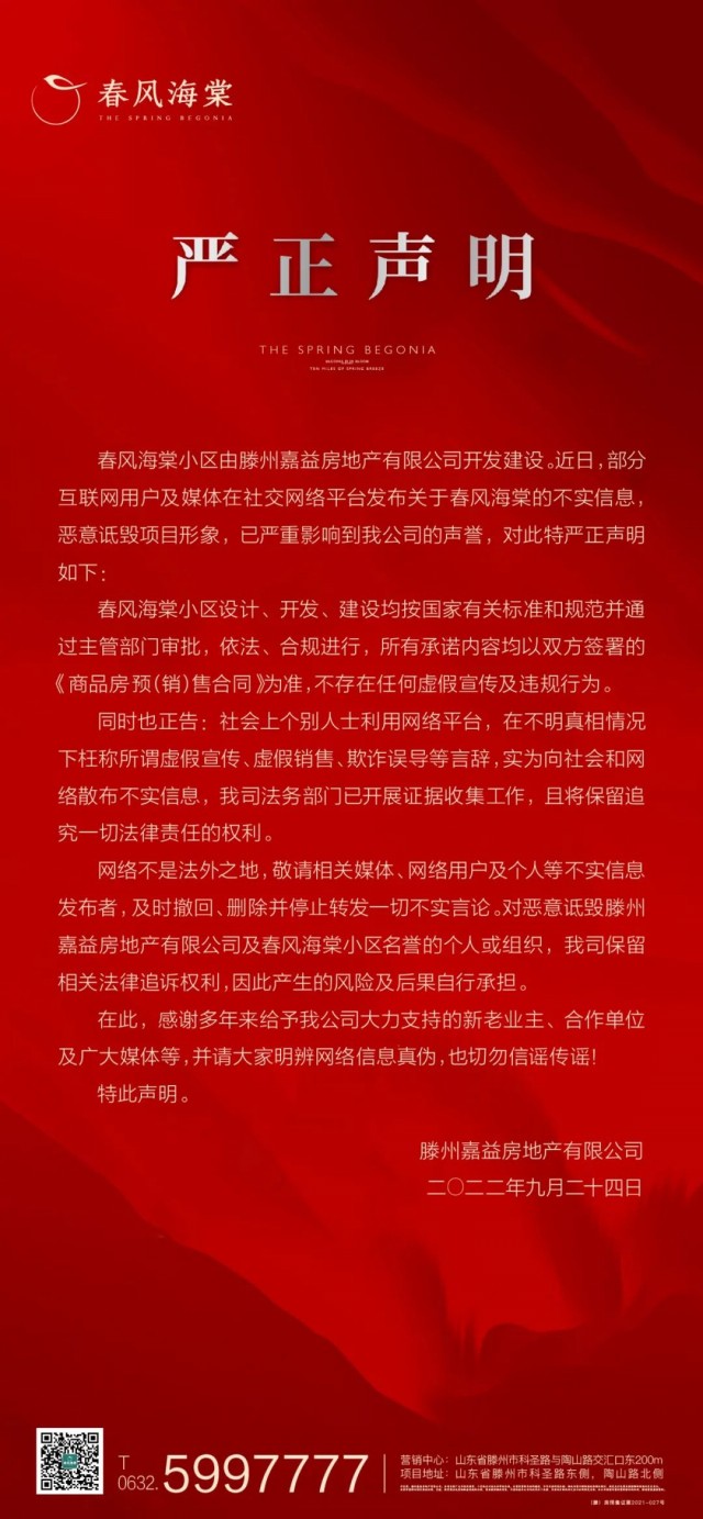 1、本項目開發商:滕州嘉益房地產有限公司;物業管理:山東雙升物業服務有限公司,推廣名為春風海棠,核準地名以地名辦審批為準;預售證號:(滕)房預售證第2021-027/031/035/043號、(滕)房預售證第2022-012/017號;