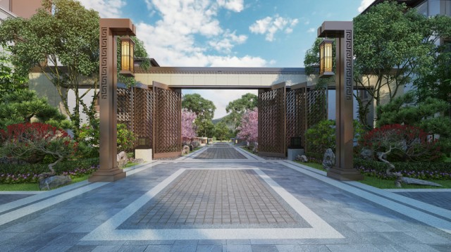 院內景觀設計呼應新亞洲建筑風格,以自然園林、山水園林、街巷園林、庭院園林四個景觀層級串聯起整個小區的景觀,植入“三坊七巷”的概念,形成靜街深巷、古樹高墻、門庭赫奕意境,彰顯傳統街巷文化、院落文化,同時院內景觀與濱河超寬景觀綠化帶的相互交融,營造出獨特的居住空間。