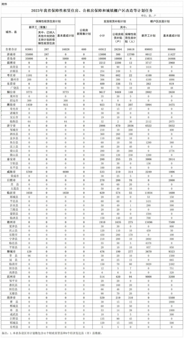 按照住房城鄉建設部辦公廳等部委聯合印發的《關于報送2023年保障性租賃住房、公租房保障和城鎮棚戶區改造等計劃的通知》(建辦?!?022〕43號)要求,省住房城鄉建設廳會同省發展改革委、省財政廳、省自然資源廳等部門,組織各地編報了2023年保障性租賃住房、公租房保障和城鎮棚戶區改造等計劃。經省政府同意,確定了山東省2023年保障性租賃住房、公租房保障和城鎮棚戶區改造等計劃,并已上報住房城鄉建設部等部委納入國家計劃?,F將我省設區市及省財政直管縣、經濟發達縣2023年保障性租賃住房、公租房保障和城鎮棚戶區改造等計劃任務予以公布。請各市及省財政直管縣、經濟發達縣在2022年12月底前公布當地2023年度計劃和項目清單,抓好項目推進,確保按期完成年度任務。