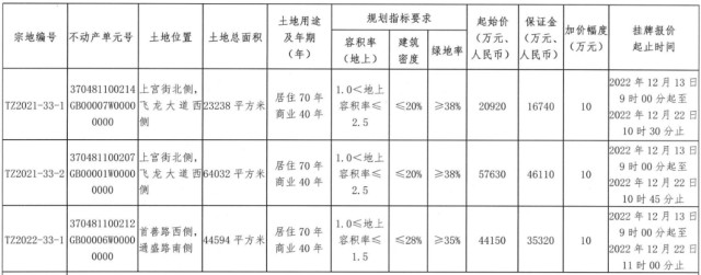 TZ2021-33-1號出讓宗地位于上宮街北側,飛龍大道西側,出讓土地面積為23238平方米,規劃用途為居住商業用地居住用地出讓年限70年、商業用地出讓年限40年。主要規劃控制指標:1.0<地上容積率≤2.5;1.0<地下容積率≤1.5,僅作為停車、儲藏室、設備用房及人防工程使用;商業建筑面積占總建筑面積(不含地下)≤5%;建筑高度不宜超過80米建筑密度≤20%;綠地率≥38%。起拍樓面價約合3600元/平方米。起始價20920萬元,保證金16740萬元。