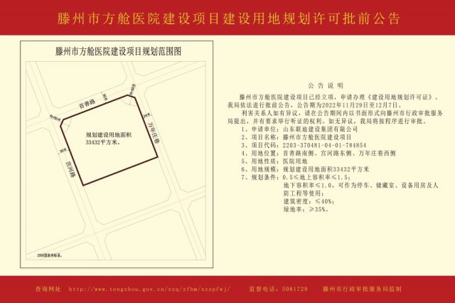 滕州市方艙醫院建設項目建設用地規劃許可批前公告