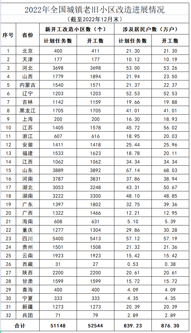 附:2022年全國城鎮老舊小區改造進展情況(截至2022年12月末)