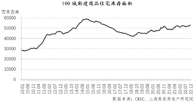 上海易居房地產研究院日前發布的報告顯示,截至2022年底全國100個城市新建商品住宅庫存總量為53058萬平方米,相比2021年底增長1.3%。