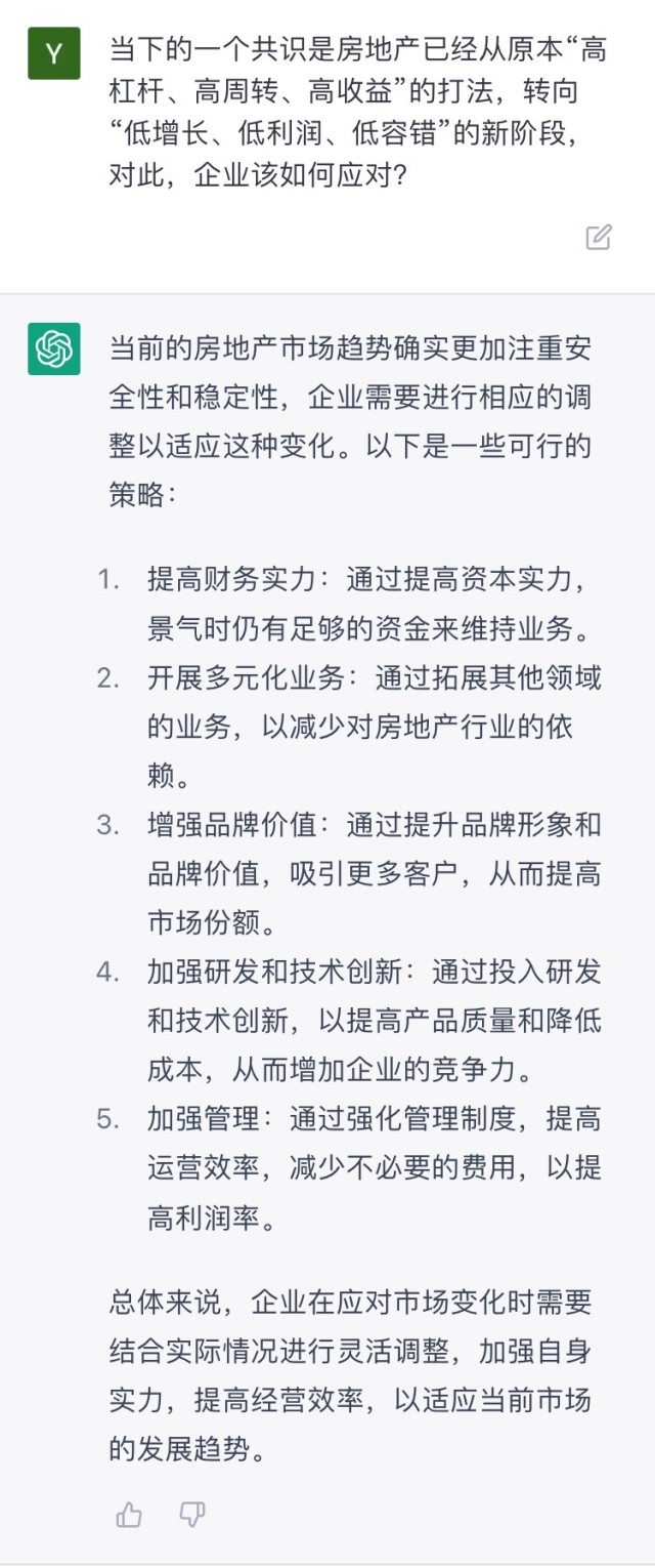 在與ChatGPT聊天的過程中,我們發現“這家伙”懂的還真不少,“他”既能給消費者提供購房建議,也能為行業從業企業如何應對形勢變化出謀劃策。