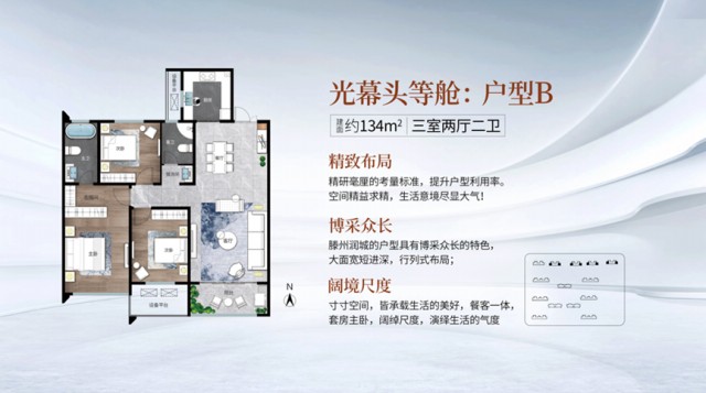 滕州潤城六大頂級價值,開篇滕州輕奢生活時代;以有限尺度空間,通過精工雕琢,打造“光幕頭等艙”戶型產品;以匠心筑城,敬獻城市菁英新貴。