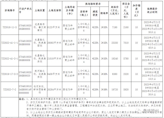 2023年3月31日,滕州市掛牌出讓5宗商住用地,總出讓面積91968平方米。起拍價總計7.988億元。詳情如下: