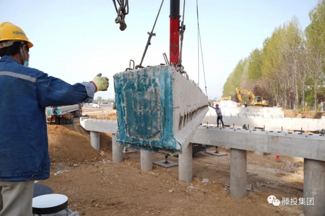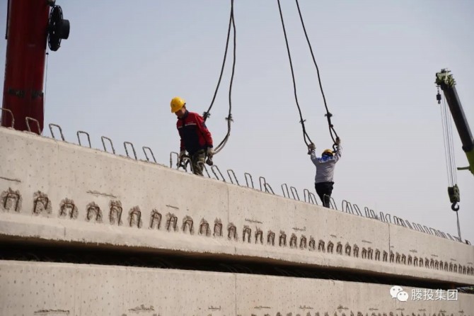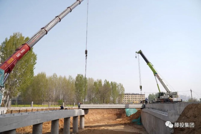 4月9日,在新華橋建設現場,幾十名施工人員正配合大型機械進行預應力空心橋板吊裝施工,這標志著新華西路橋梁工程由下部基礎結構施工全面轉入橋面施工。