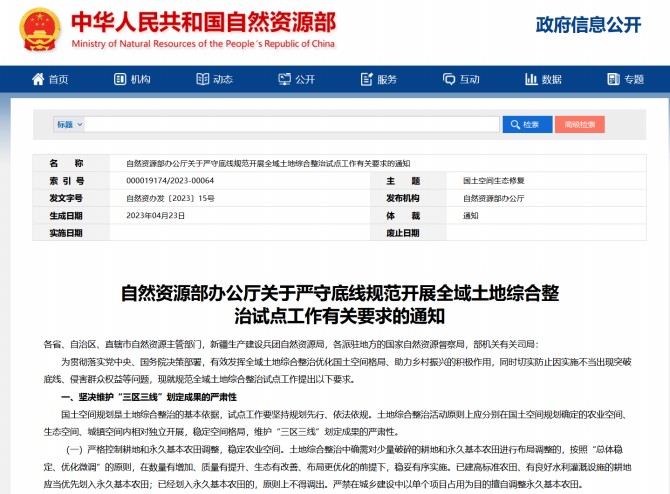 為有效發揮全域土地綜合整治優化國土空間格局、助力鄉村振興的積極作用,同時切實防止因實施不當出現突破底線、侵害群眾權益等問題,自然資源部辦公廳4月25日發布《關于嚴守底線規范開展全域土地綜合整治試點工作有關要求的通知》,明確嚴禁以土地綜合整治名義調整生態保護紅線。嚴禁破壞生態環境砍樹挖山填湖,嚴禁違法占用林地、濕地、草地,不得采伐古樹名木,不得以整治名義擅自毀林開墾。