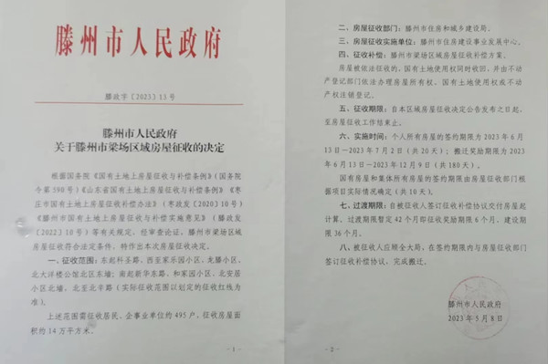2023年5月8日,滕州市人民政府作出了滕州市梁場區域房屋征收決定后,本中心工作人員在公證處見證下予以現場張貼。