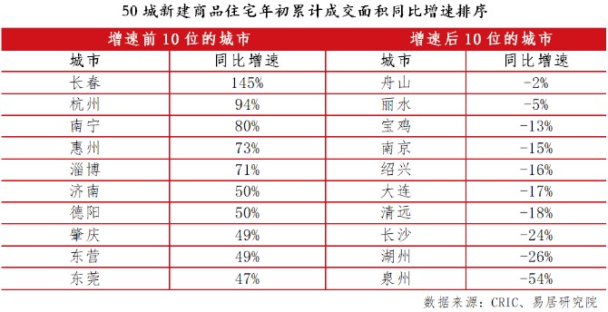 從年初累計情況來看,長春、杭州、南寧、惠州、淄博、濟南、德陽、肇慶、東營和東莞等10個城市交易行情較好,同比增速均接近或超過了50%。在易居研究院看來,此類城市具有兩方面特征:一是,部分城市購房政策明顯寬松;二是,部分城市壓抑的市場需求持續釋放。