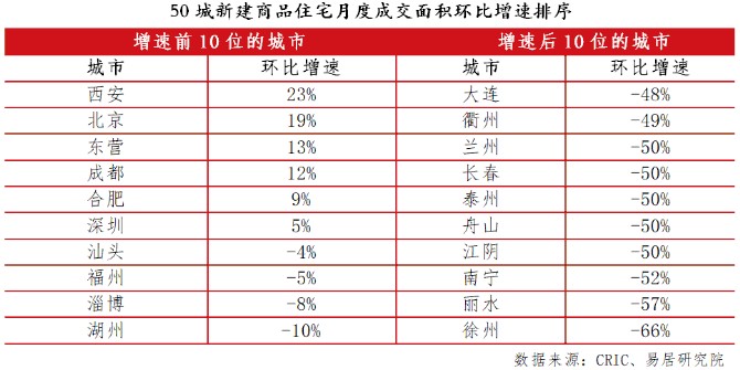 其中,僅西安、北京、東營、成都、合肥和深圳6個城市環比上漲,增速分別為:23%、19%、13%、12%、9%和5%。此外,包括蘭州、長春、泰州、舟山、江陰、南寧、麗水和徐州在內的8個城市,環比降幅達到或超過50%,市場調整程度可見一番。