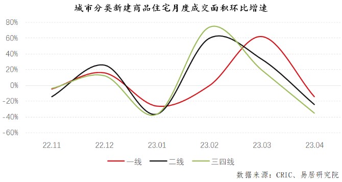 從城市分類來看,自3月份沖高后普遍回落,三類城市均出現環比下降態勢,其中三四線城市下滑較為明顯。