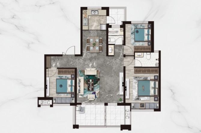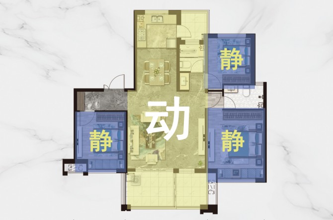 好的戶型當然要具備良好的私密性,動靜分離是必備的條件。戶型的三個臥室都分別處在相互隔絕的位置,能夠保證臥室之間的隱私,即使三代同堂也能輕松應對。
