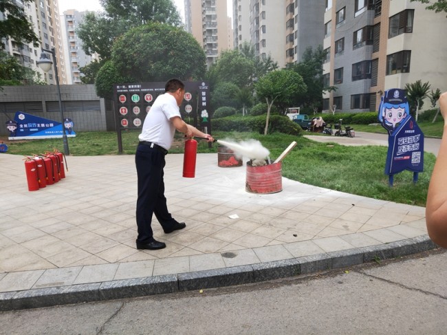 在消防器材操作培訓階段,人和天地物業服務中心副經理李文廣講解了消防器材的使用方法、滅火注意事項,并就如何使用消防栓、滅火器材進行了現場示范。