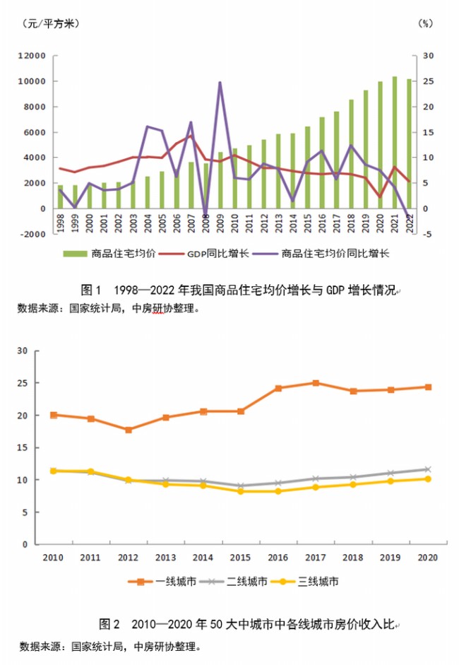 第一,我國房價到底高不高?根據國家統計局統計數據分析,自1998年以來,我國平均房價持續上漲,2021年平均房價已突破萬元。1998-2021年間平均房價復合增幅達到7.79%。期間,房價增速多次超過同期GDP增速,兩者比值于2020年達到峰值3.39,遠超國際上普遍認可的“1以內”的合理范圍。