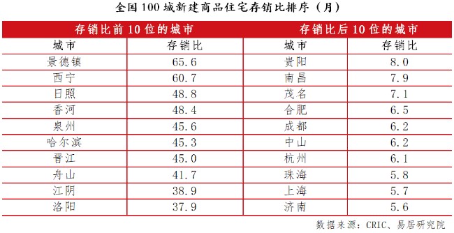 具體到城市,通過對5月份全國100個城市新建商品住宅存銷比進行排序,包括濟南、上海、珠海、杭州、中山和成都在內的城市去庫存不錯。相反,包括景德鎮、西寧、日照和香河等城市,由于外來人口相對少,購房需求不強勁,導致去庫存周期偏高。