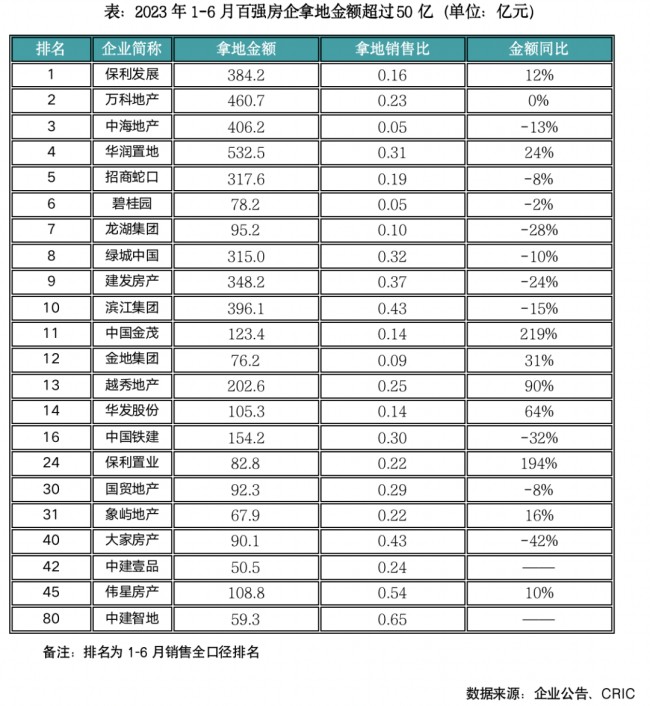 根據克而瑞研究中心監測,央國企中,華潤置地、保利發展、中海地產、招商蛇口等央企拿地金額超過300億元,其中,保利發展、華潤置地上半年拿地金額較去年同期增長12%和24%。而民企中,濱江、偉星在深耕區域積極參拍,拿地銷售比分別為0.43和0.54,顯著高于行業平均。
