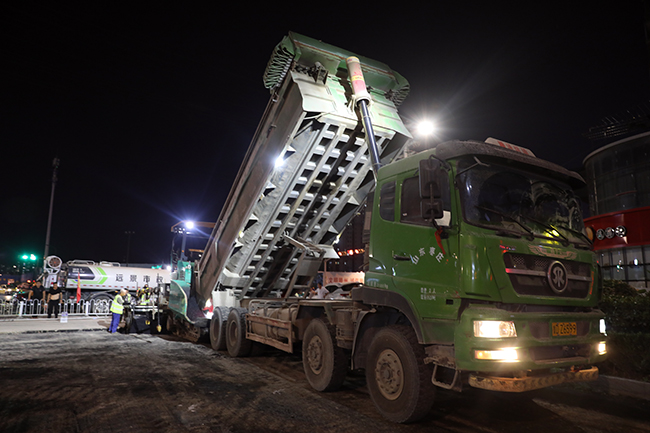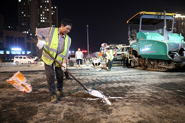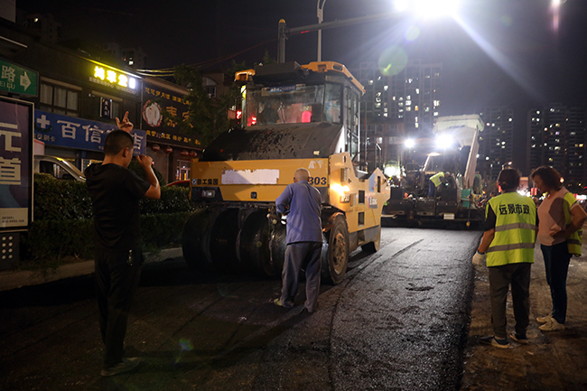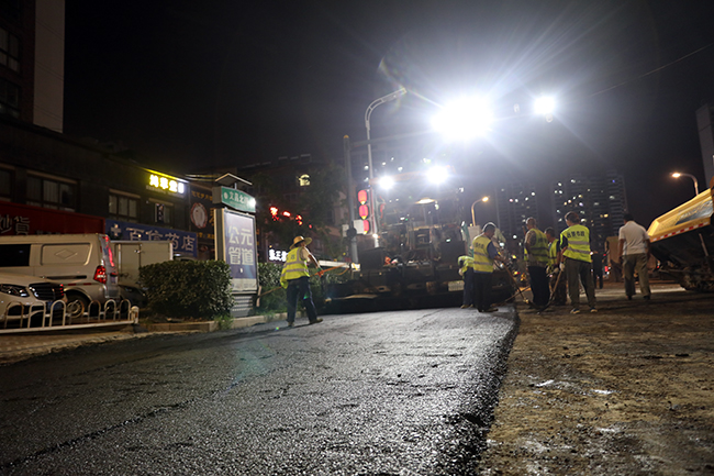 在道路提升文昌路施工現場,為保證項目建設進度,施工現場燈火通明,機械轟鳴,現場一派熱火朝天施工場景。