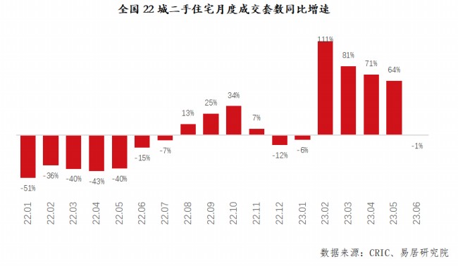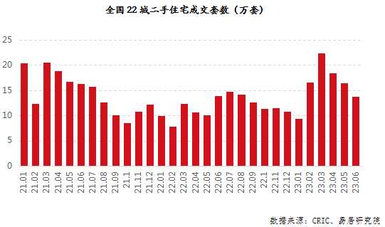 根據易居研究院發布的報告顯示,6月份在其監測的全國22個重點城市中,二手住宅成交套數為13.7萬套,環比減少17%,同比減少1%。