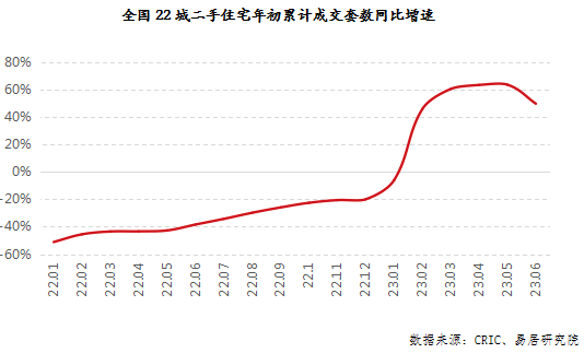 另外,從年初交易累計情況看,上半年全國22個城市二手住宅成交套數為97萬套,同比增速為50%,但相比1-5月份的63%則出現了明顯的收窄。
