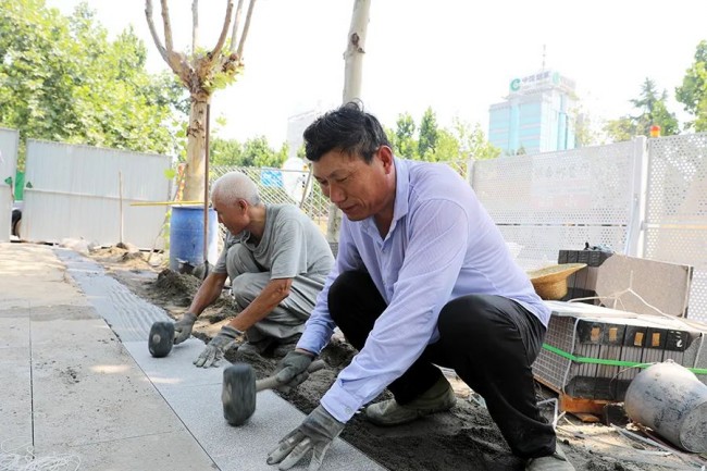 在大同路提升施工現場,施工人員嚴絲合縫對路面進行鋪裝。據了解,大同路提升工程的主要任務包括實施路面覆鋪、人行道提升改造、路沿石整修、無障礙設施建設、停車位設置、綠化提升、立面改造等。