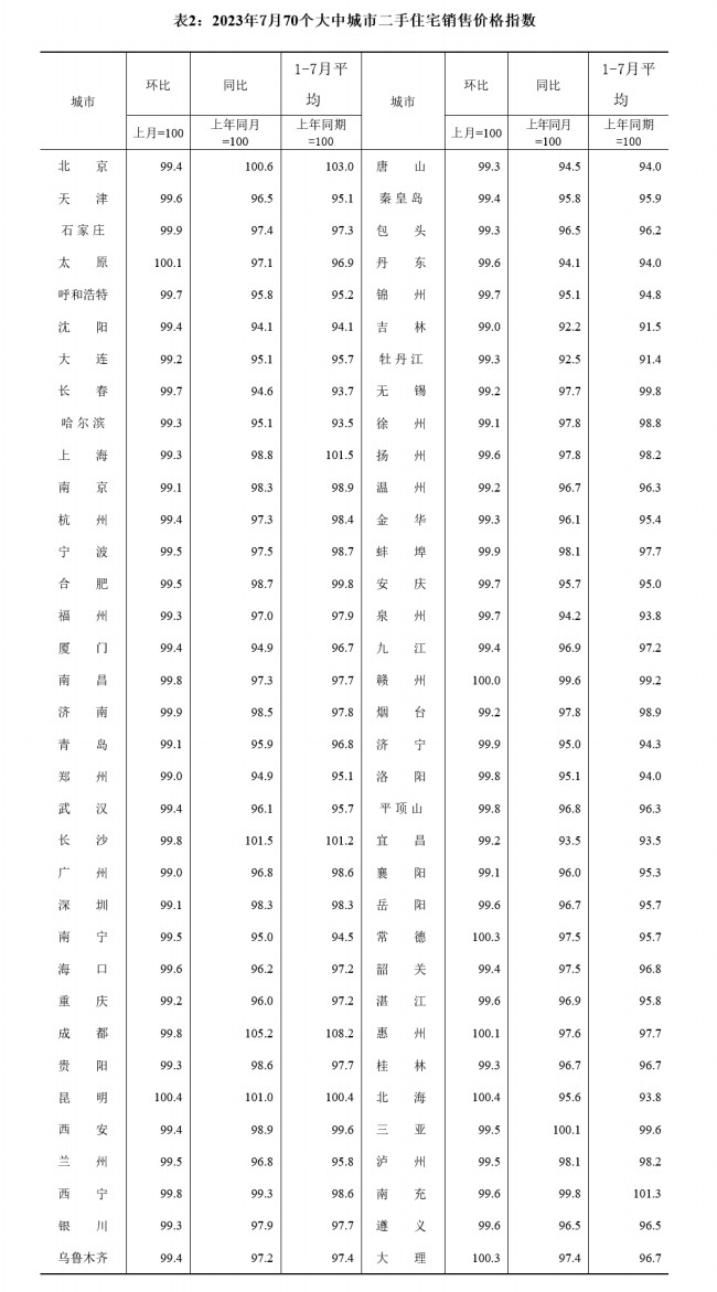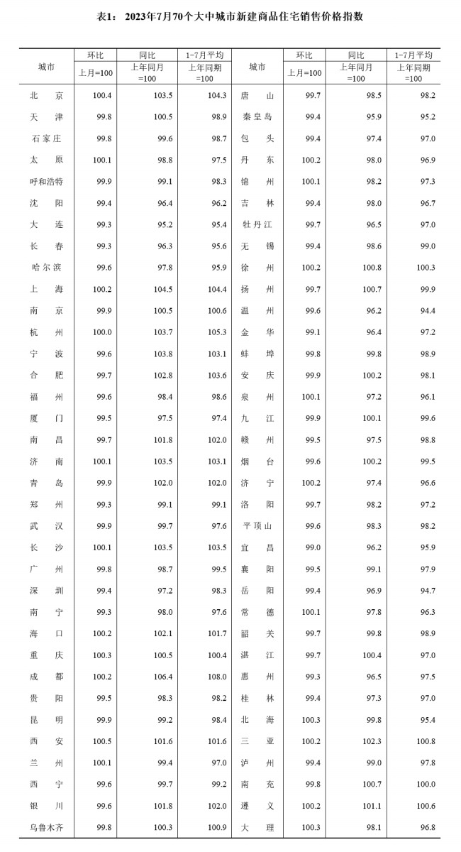 7月份,70個大中城市商品住宅銷售價格上漲城市個數減少,各線城市商品住宅銷售價格環比持平或下降、同比有漲有降。