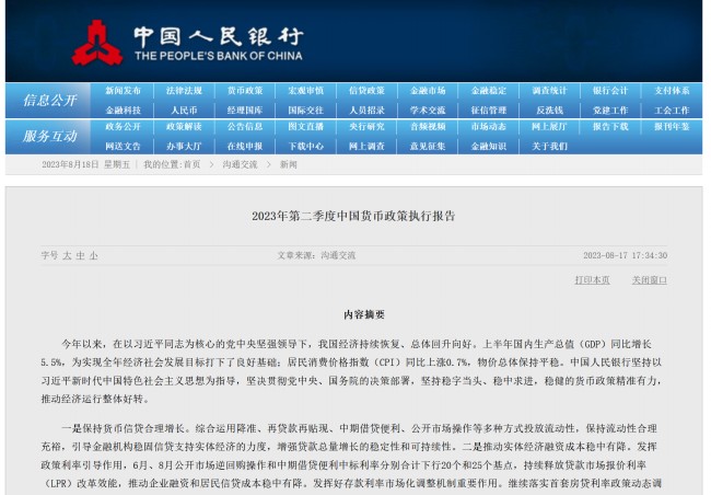 8月17日,中國人民銀行發布《2023年第二季度中國貨幣政策執行報告》。
