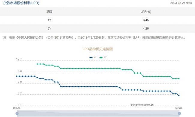 日前,中國人民銀行授權全國銀行間同業拆借中心公布,2023年8月21日貸款市場報價利率(LPR)為:1年期LPR為3.45%,5年期以上LPR為4.2%。