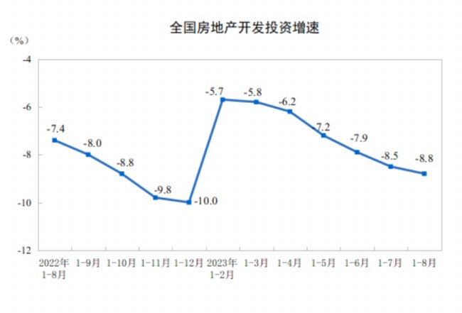 具體來看,房地產開發投資增速跌幅繼續擴大。1-8月份,全國房地產開發投資76900億元,同比下降8.8%;其中,住宅投資58425億元,下降8.0%。