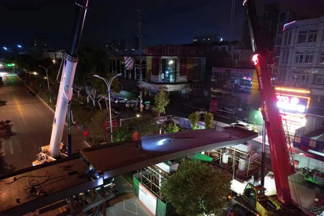 9月17日凌晨,學院路前進小學處鋼結構人行天橋主體吊裝合龍。