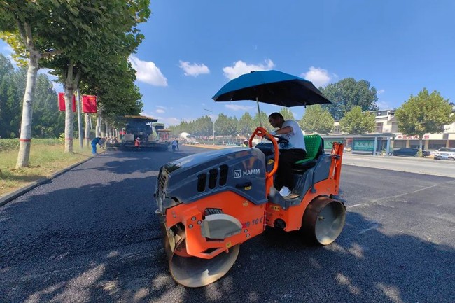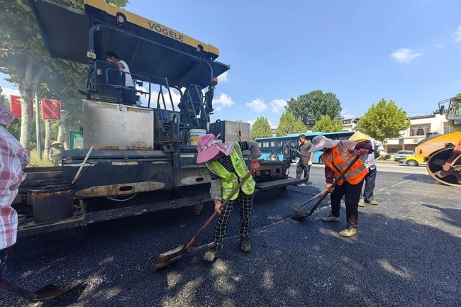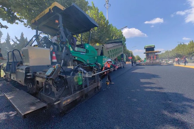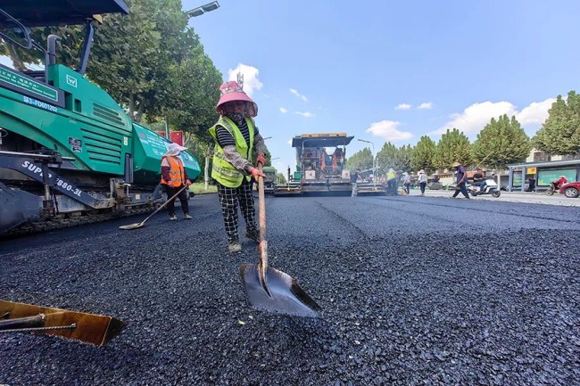 9月20日,在北辛路提升工程施工現場一片熱火朝天的施工景象,聯迪集團施工人員正在對路面進行瀝青鋪設。