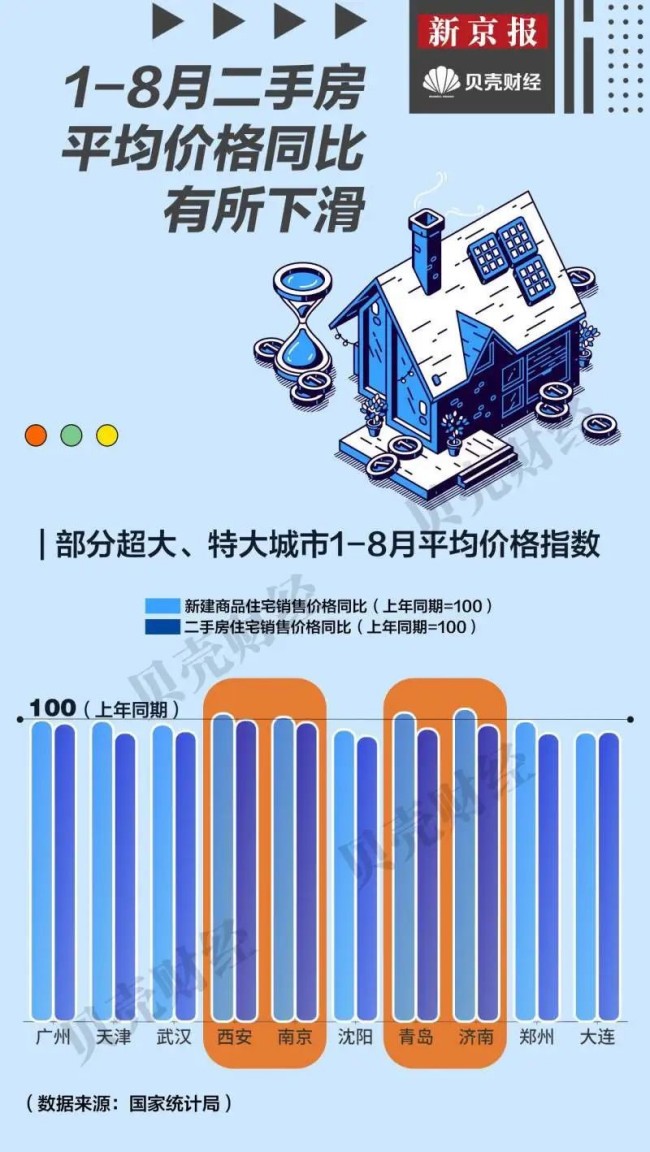 據新京報貝殼財經記者不完全統計,截至9月20日,已有17城取消或松綁住房限購政策。9月這波樓市松綁熱潮中,除了像關注廣州這樣的一線城市,還有像武漢、西安等特大城市。從已調整限購政策的特大及以上城市房價來看,今年1-8月平均二手房價格均相比去年同期有所下滑,僅西安、南京、青島、濟南4地新建商品住宅銷售平均價格相比同期有所上浮。