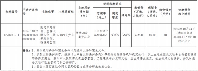 據公開信息顯示,TZ2023-5-1地塊位于荊河東路南側、呈祥大道東側、兼愛路北側、明德路西側,出讓土地面積為56049平方米,規劃用途為居住商業用地,居住用地出讓年限70年、商業用地出讓年限40年。起始價46250萬元。按照容積率1.8計算,起拍樓面價約4584元/平方米。