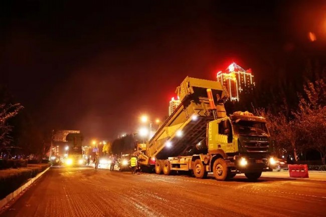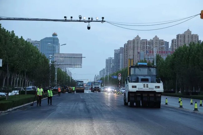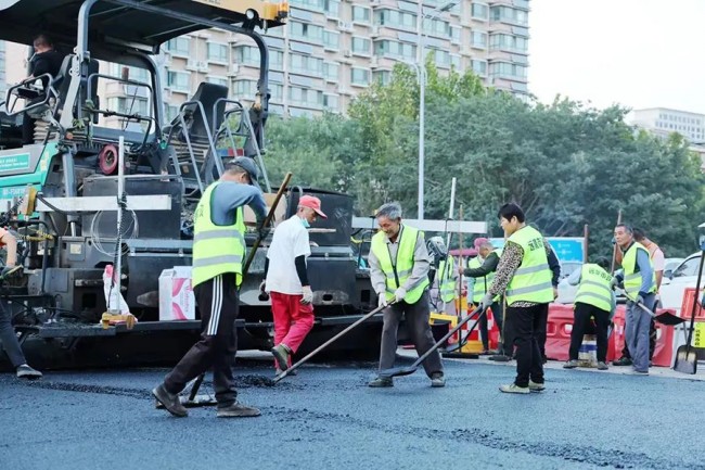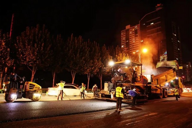 10月9日下午5時許,記者在施工現場看到,數十名施工人員正在揮汗奮戰,多臺機械車開足馬力,來回穿梭。攤鋪機一邊前進,一邊將冒著熱氣的瀝青傾倒在路面上,工人們迅速用鐵鍬推平瀝青,并在推土機、壓路機等協助下,把瀝青攤平整實、反復碾壓,確保道路面層瀝青粘合緊密。