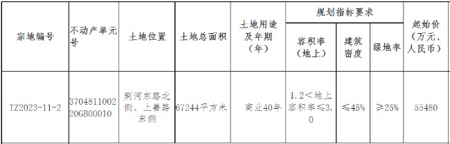 TZ2023-11-2號出讓宗地位于荊河東路北側,上善路東側,出讓土地面積為67244平方米,規劃用途為商業用地,出讓年限40年。