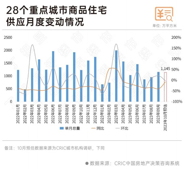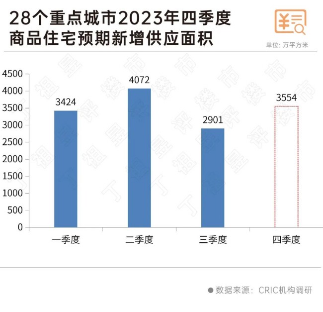 根據CRIC調研,28個重點城市2023年四季度商品住宅預期新增供應面積3554萬平方米,環比三季度上漲23%。