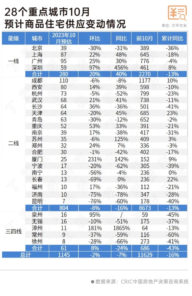 據CRIC調研,10月28個重點城市預計新增商品住宅供應面積1145萬平方米,環比微降2%,同比下降7%,前10月累計供應面積將達到11629萬平方米,累計同比跌幅為16%。預計四季度將迎來年內新的供應高峰。