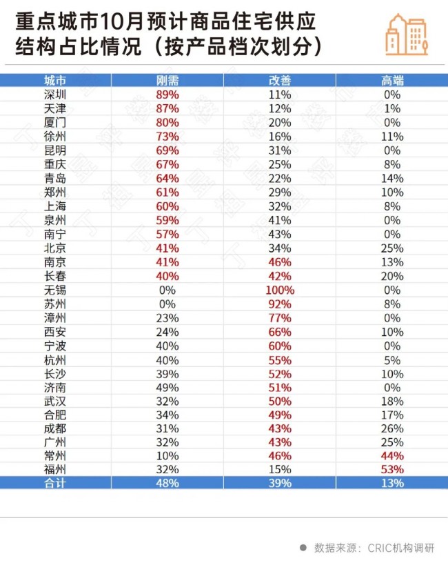 而上海、北京和深圳也加強了剛需產品的供應,其中深圳剛需產品供應占比高達89%。