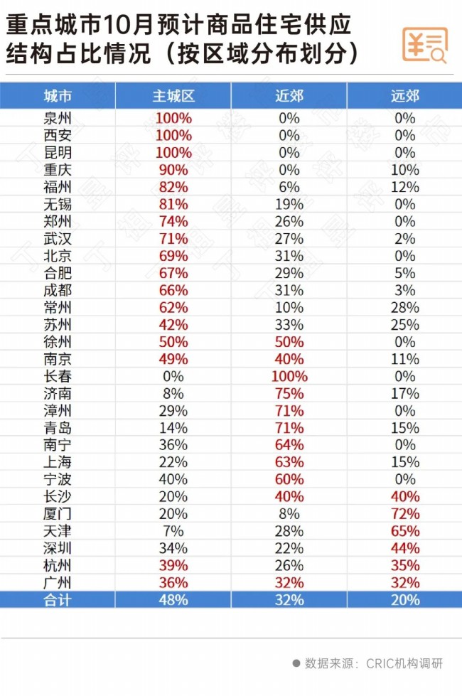從供應結構各項目區域分布來看,重點城市主城、近郊、遠郊占比結構為48%、32%和20%,主城區仍是供應重心。