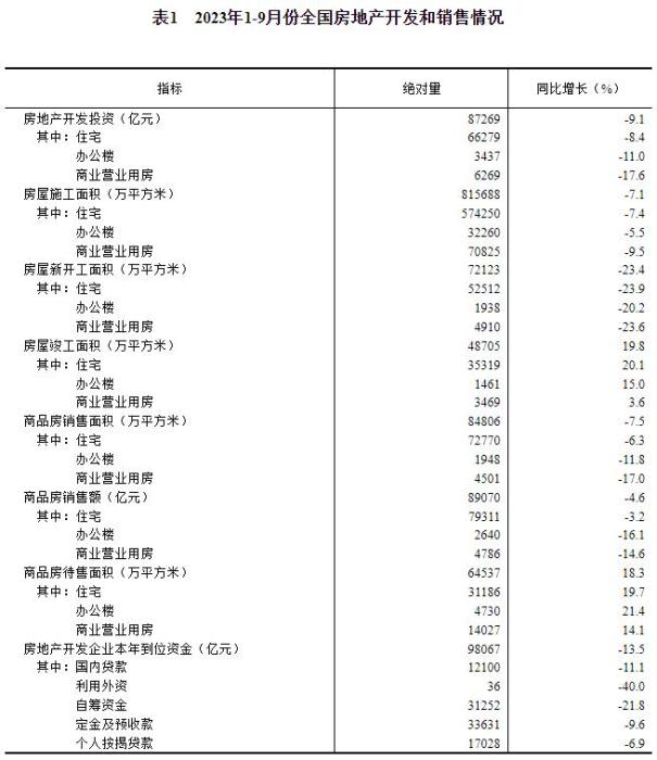 國家統計局網站18日發布1—9月份全國房地產市場基本情況。