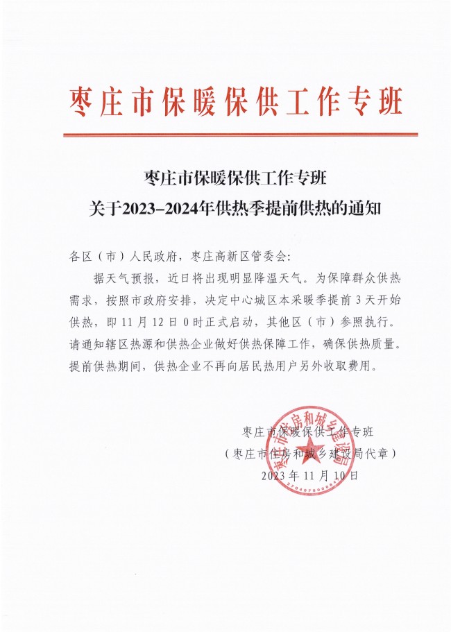 據天氣預報,近日將出現明顯降溫天氣。為保障群眾供熱需求,按照市政府安排,決定中心城區本采暖季提前3天開始供熱,即11月12日0時正式啟動,其他區(市)參照執行請通知轄區熱源和供熱企業做好供熱保障工作,確保供熱質量。