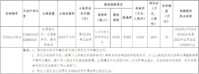TZ2014-17B-4號宗地位于永昌路北側、文昌路東側、善文街南側,土地總面積15039平方米。土地用途及年期為:住宅70年、商業40年。容積率要求為1.0<地上容積率≤2.8,建筑密度≤32%,綠地率≥35%,起始價15340萬元。按照最高地上容積率2.8計算,折合起拍樓面價約3643元/平方米。