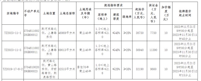 山東悅城投資運營有限公司以56940萬元競得TZ2023-11-3號地塊,出讓宗地位于荊河東路北側,上善路東側,出讓土地面積為69013平方米,規劃用途為商業用地,出讓年限商業40年。按照容積率3.0計算,樓面價2750元/平方米。
