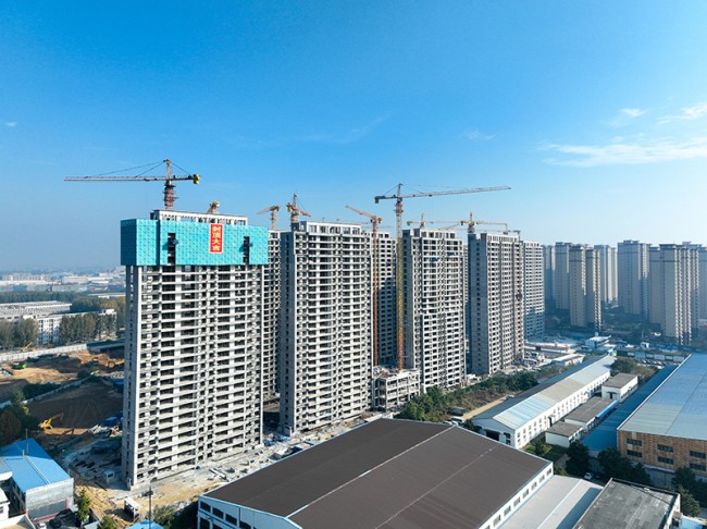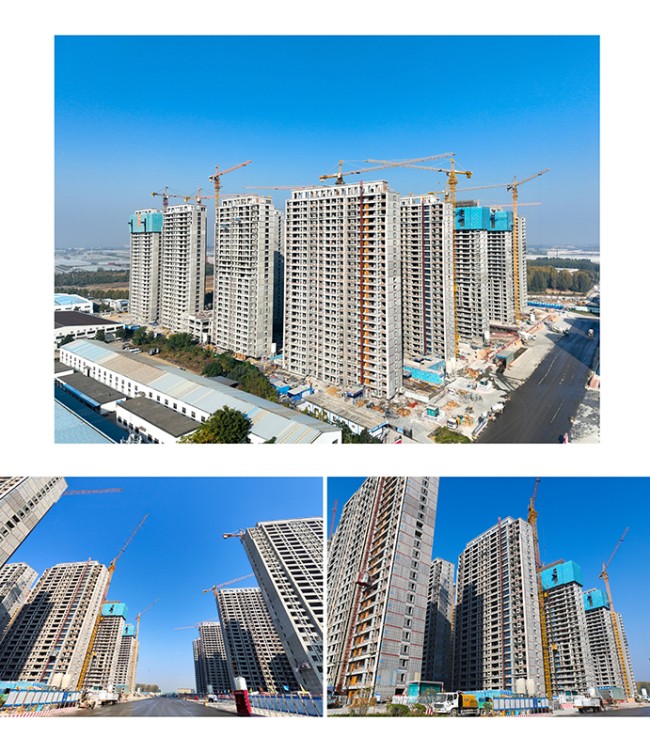 目前17棟樓全部主體封頂,4棟樓內墻抹灰完成,正進外墻抹灰、樓地面施工,2棟樓正在內外墻抹灰,樓地面清理,11樓棟正在進行二次結構施工。