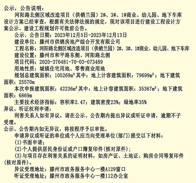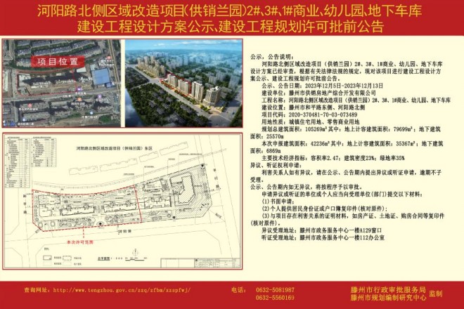 河陽路北側區域改造項目2#、3#、#商業、幼兒園、地下車庫建設工程設計方案公示、建設工程規劃許可批前公告