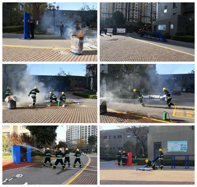 在實戰演練階段,按照演練流程,消控室人員接到消防監測系統報警后,馬上查看火情及鎖定位置,并向市消防大隊報警救援,立即啟動防火應急處置預案,迅速成立防火救援指揮部,同時組織小區消防應急隊、社區醫護人員、物業工作人員成立滅火組、疏散組、救護組、后勤組開展滅火任務。疏散組、救護組和后勤保障組迅速展開滅火疏散和自救行動;滅火組在隊長的正確指揮下身著消防服、持滅火水帶、手提滅火器,迅速到位,將“火”撲滅;救護組對傷員進行心肺復蘇救援。整個過程緊張有序,各小組分工明確、默契配合圓滿完成了演練任務。