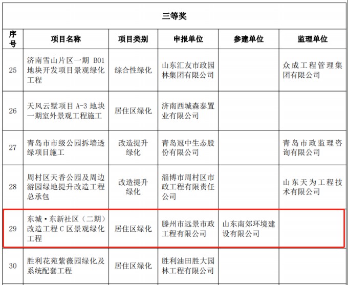 12月15日,由山東省建設工會、山東省園林綠化行業協會聯合組織的2023年度“園林優質工程”優秀成果競賽評選結果揭曉,由信華發展公司投資、遠景市政公司承建的信華城·珹園(又名:東城·東新社區(二期)改造C區)景觀綠化工程,榮獲山東省園林綠化行業2023年度“園林優質工程”三等獎。