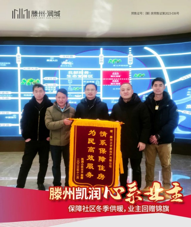 滕州凱潤花園小區由于2023年社區業主入住率不足,因此未能到達社區冬季供暖的條件和標準;但滕州正宇房地產開發有限公司領導在了解到業主們的入住情況和生活訴求后,全力溝通對接相關部門,在開發公司的全力接洽和辛勤付出下,凱潤花園小區最終在今年寒冬之中實現供暖;業主代表特地送來了表達感謝的錦旗!